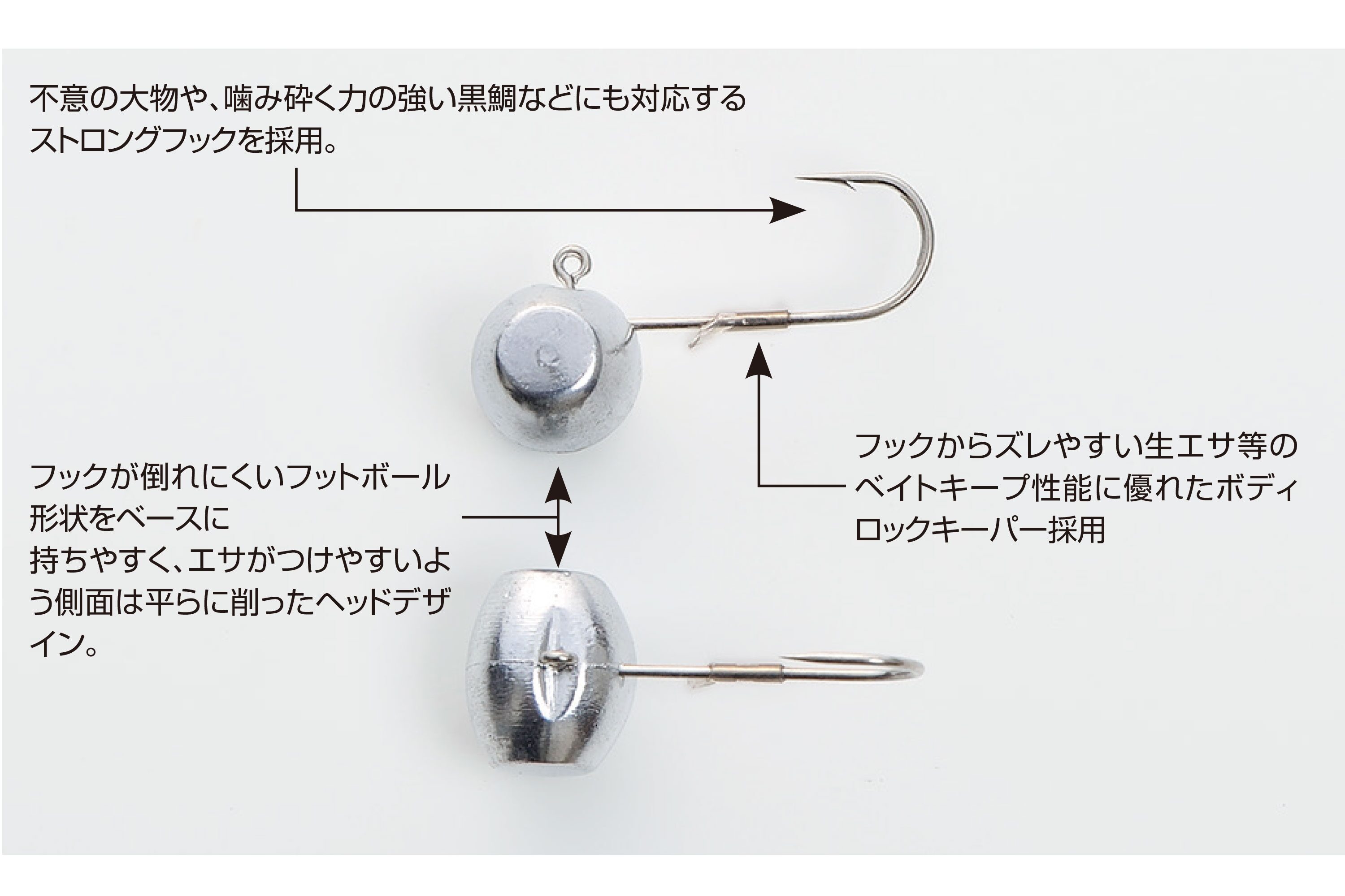 特徴としてシンカー部分がフットボール型で、フックには青イソメなどの餌でもずれにくいキーパーが付いてます。フットボール型シンカーなので常に針先が上を向いている為、針先が障害物にあたることによる根がかりが起きにくくなってます。